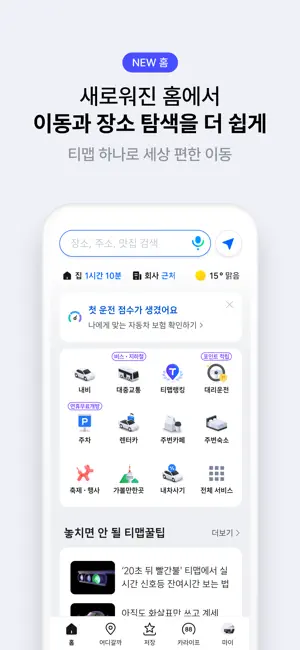AI로 맛집·장소 탐색부터 운전까지 더 똑똑하게. 도보이동·대중교통·대리·주차·렌터카가 필요할 때도 티맵과 함께 하세요!
