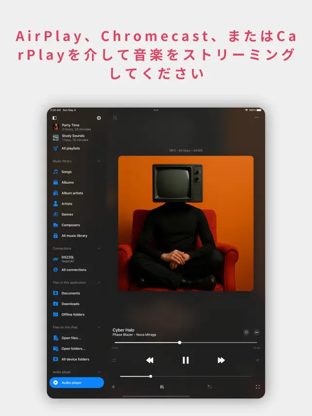 SMB、WebDAV、またはDLNAプロトコルを使用して接続してください。高度なバッファリング技術により、スムーズな再生を実現します。iTunesファイル共有やWi-Fiファイル転送を使用して、コンピュータからオーディオファイルをインポートしてください。
