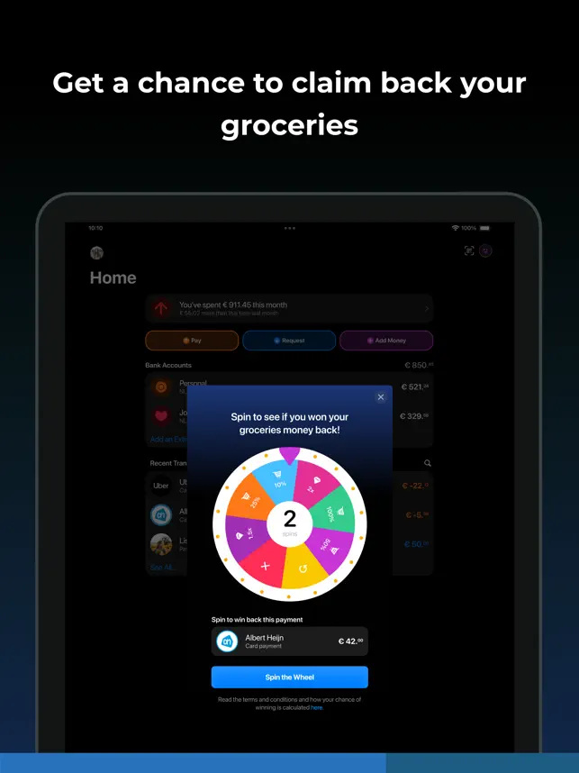• 3 Bank Accounts to get you started • Instant Payments and real-time notifications • 1 Virtual Card with Apple Pay support • Scheduled Payments and AutoAccept for requests • Withdraw cash at ATMs (€2.99/withdrawal) • Earn 3.01% interest on USD/GBP savings • Invest in stocks with ease • Buy and sell cryptocurrencies in the EEA • €1,000 ZeroFX for foreign payments • Get a chance to win your grocery bill back every week • Pocket money: stress-free, automated allowance for your child • Empower your child to save with smart saving features • Get exclusive rewards like a Metal Card by inviting your friends to bunq • Save up to 90% on roaming costs with an eSIM from bunq • Plant a tree for every €1,000 spent