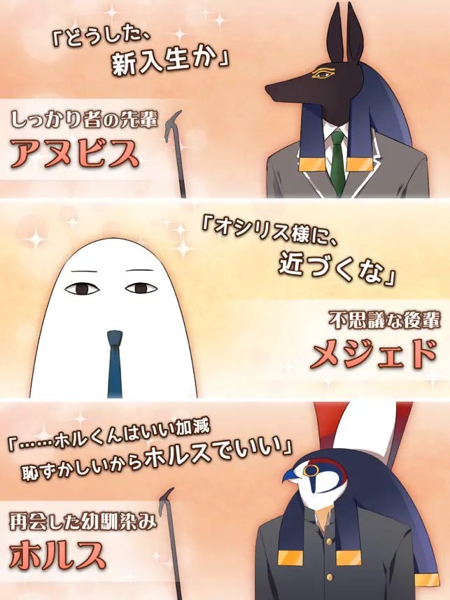 - 飽きないし、一人でも表情筋が動く 笑いあり涙ありで泣けるところは泣けて面白い時に笑えるから表情筋の運動になる。あと絵とかがちゃんとエジプト感があるから本当に前にいるのでは!?みたいになる(個人的な感想と妄想です)