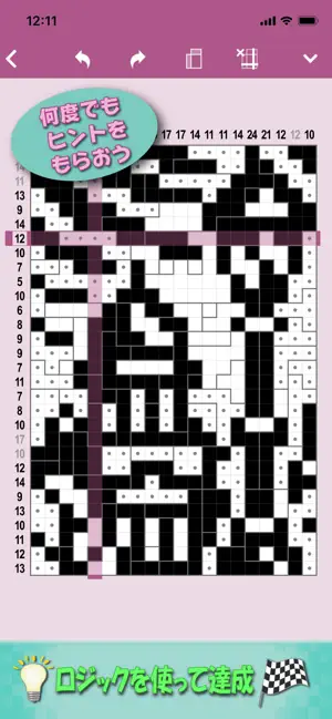 数字をヒントにしてルールに従いマスを黒にするか白にするかを決定していきます。全てのマスが正しく黒か白かに決定されると盤面に隠された絵が浮かび上がってきます。