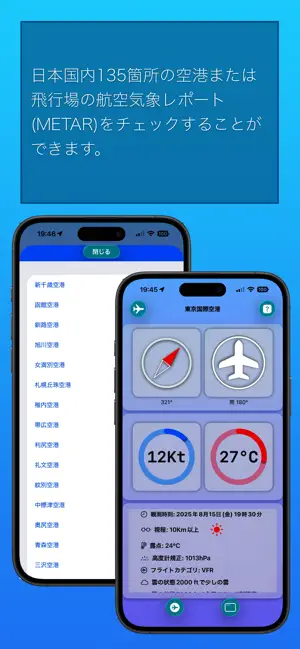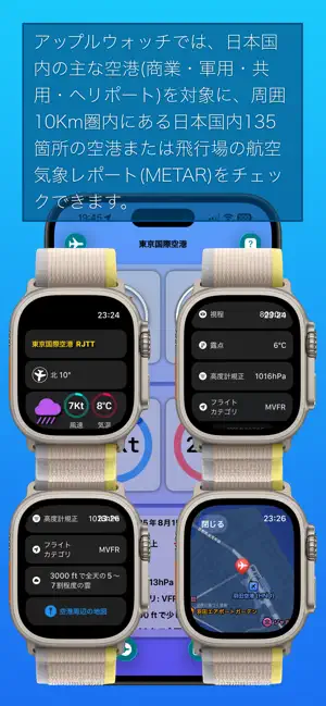 アプリとアップルウォッチでは、日本国内の主な空港(商業・軍用・共用・ヘリポート)を対象に、周囲10Km圏内にある日本国内135箇所の空港または飛行場の航空気象レポート(METAR)を、アプリを起動するだけでチェックできる航空気象専用アプリです。周囲10Km圏内に空港がない場合は、一般的な天気概況をお伝えします。