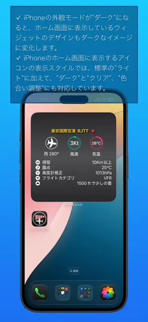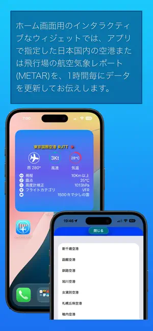 ホーム画面用のウィジェットでは、アプリで指定した日本国内の空港または飛行場の航空気象レポート(METAR)を、1時間毎にデータを更新してお伝えします。また、エラー画面では、再度、METAR情報を検索するインタラクティブなボタンをサポートしています。s