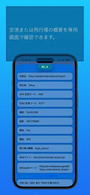 また、アプリでは空港または飛行場の概要を専用画面で確認できます。