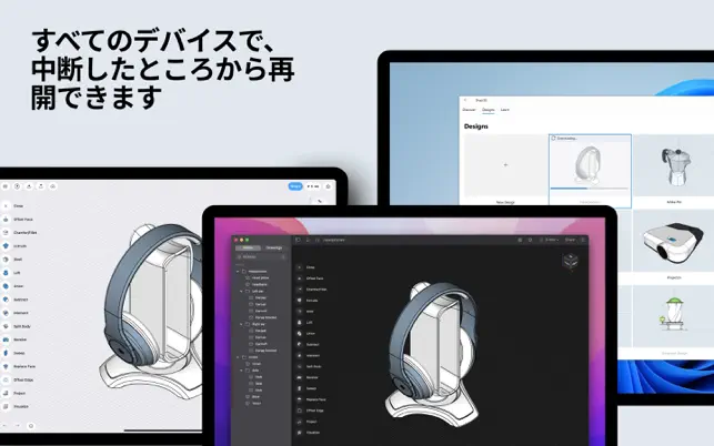 マルチデバイスを想定した初の CAD ツールを活用して、デバイスと入力ツールを選択します。ハイブリッド ワークフローは、デバイス間の自動同期により、機能横断的なチームプロセスに対応します。どのデバイスでも、オフラインでも作業ができます。どこにいても最高の状態でデザインやコラボレーションが可能です。