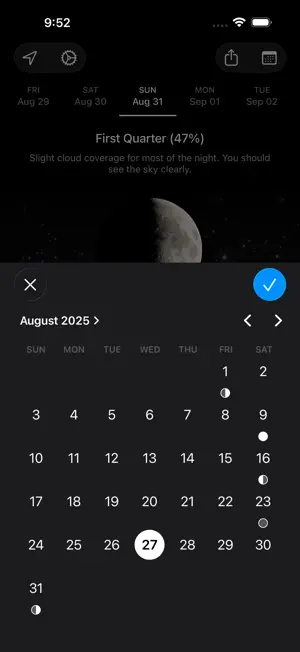 - View the moon cycle for any date in the future by scrolling on the date bar or by tapping the calendar button! - Either allow the app to use your current location or manually select a location of your choice to use! - See how cloudy the sky is expected to be on upcoming days so you can work out whether you'll be able to see the moon or not! - Find the upcoming moon phases straight on the main screen - you'll instantly know when the next full moon, new moon, first quarter and last quarter are. - Golden hour and blue hour times are available to allow you to calculate when to take photos. - More specific information is available such as the moon's distance from Earth, the age of the moon as well as the current altitude. This is available for any date on the lunar calendar. - Receive notifications when the moon reaches a particular phase of your choice. - Optimized for the latest iPhone and iPad models. - Completely free of charge for all functionality, no in-app purchases.
