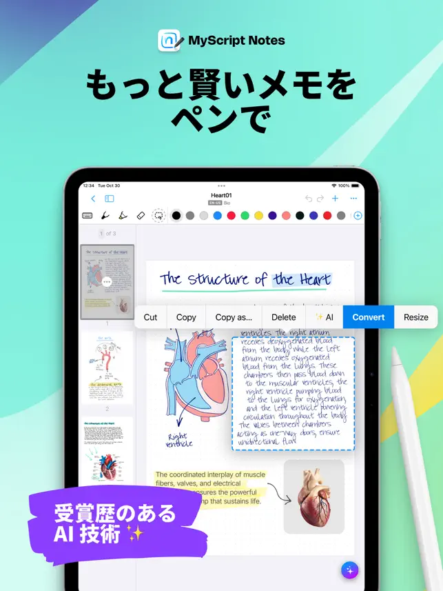 • 既存の文書を PDF 形式でインポートして注釈を追加。 ———————— デジタル手書き • 同じページ、文章、または単語内で書く¹、タイプ入力、ディクテートすることが可能。 • 手書きのテキストや数式をデジタルテキストに、また、描いたダイアグラムを完全な図形に正確に変換。ダイアグラムは、PowerPoint に貼り付けても編集可能な状態を保ちます。 • ペンを使って絵文字や記号を書く。 ペンを使って編集 • 直感的なジェスチャーで、フローを遮ることなく、メモを編集および書式設定。 • マーカーでハイライト表示または色をつける、ラッソで選択、消しゴムでストローク全体または定義したコンテンツだけを正確に削除。 ボード上に思うがままに書く、タイプする、描く • ブレーンストーミング、マインドマッピング、フリーフォームのメモ作成に最適な無限のキャンバスをお楽しみください。 • パニング操作や拡大/縮小で視野を変えることが可能。 • ラッソを使ってコンテンツを選択、移動、コピー、削除、サイズ変更、また手書きコンテンツをデジタルテキストに変換。 文書に切り替えて応答型エクスペリエンスを楽しむ • 構造化メモを作成および編集 – 必要に応じて、手書きコンテンツが自動的にリフロー。 • 見やすさを損なうことなく、編集、レイアウト調整、デバイスの回転、画面分割が可能。 内容豊かなメモを作成 • さまざまなペンタイプやページの背景を使用してコンテンツをパーソナライズすることが可能。 • 写真、スケッチ、および数式やダイアグラムなどのスマートオブジェクトを追加。 • 複数行にわたる数式や行列の手書き作成、簡単な計算、数式を LaTeX または画像としてコピーすることが可能。 ———————— MyScript Notes はお客様のプライバシーを尊重しており、お客様の明示的な同意なしにコンテンツを弊社サーバーに保存することはありません。 サポートが必要な場合、または新機能のリクエストについては、https://myscri.pt/support でチケットを作成してください MyScript Notes のウェブページでクロスプラットフォームに関する詳細をご覧ください: https://www.myscript.com/notes ———————— ¹MyScript Notes での書き込みには、Apple Pencil など、互換性のある任意のアクティブペンまたはパッシブペンを使用できます。MyScript Notes の最低要件および推奨要件については、こちらをご覧ください: https://myscri.pt/notes-devices