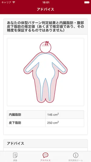 - え? メジャーまで使って、長ったらしいデータ入力して、出てきたアドバイスが「内臓脂肪」「皮下脂肪」「あなたは〇〇体型です」だけ?