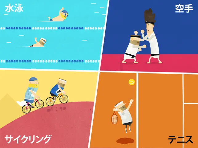 今バスケットボール、空手、BMX、トランポリン、体操、乗馬、ビーチバレーボール、卓球、ハイダイビング、アーチェリー、フェンシング、Kayakの、テニスと、より多くのような37の素晴らしいスポーツで
