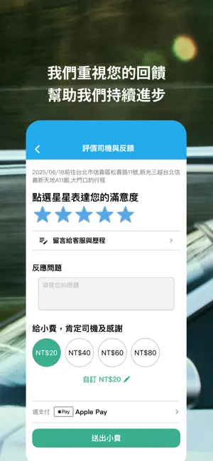使用173叫車App搭乘時,您可分享行程讓家人安心、評價司機幫助我們提升服務品質、選擇折扣優惠搭愈遠省愈多。