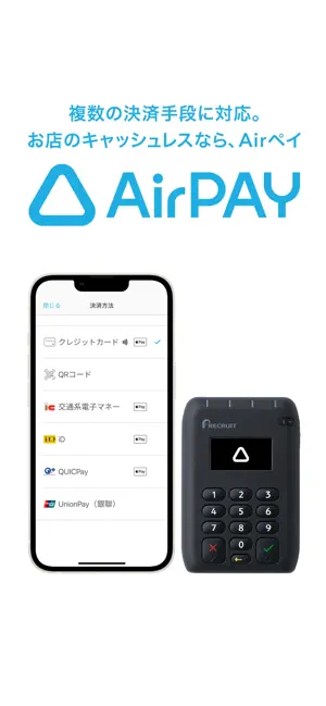 Airペイ(エアペイ)は、カード・電子マネー・交通系電子マネー・QRコードのキャッシュレス決済をお店に導入できるサービスです。