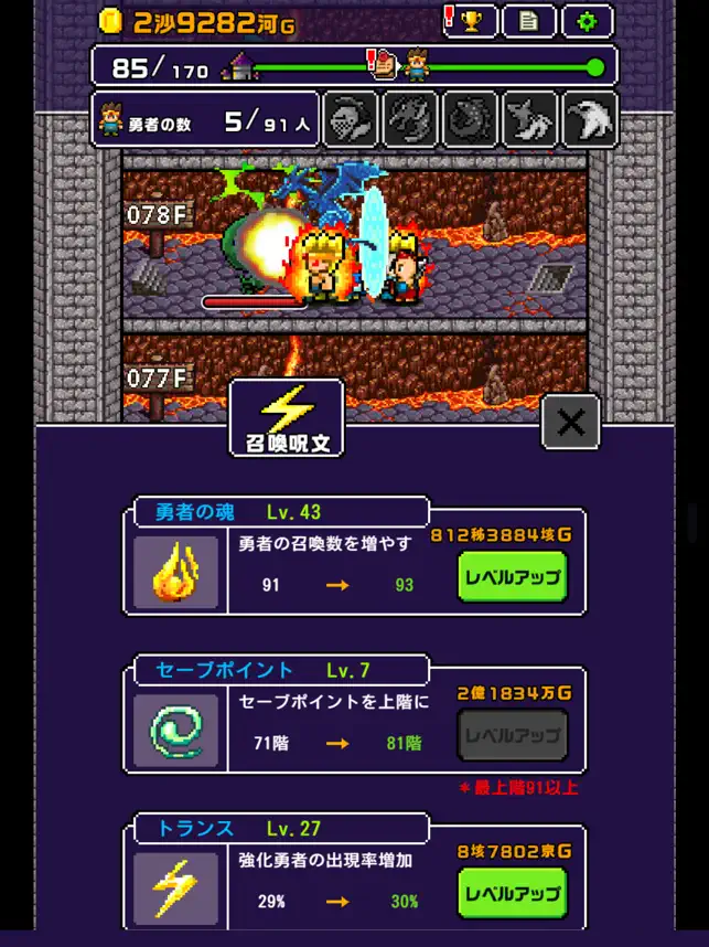 このゲームは敵を倒す事や動画(広告)を閲覧する事で得られるコインを使って、勇者や仲間(現在59人)の強化を行い何度も敵を倒しステージを攻略していく形の放置ゲー?です!