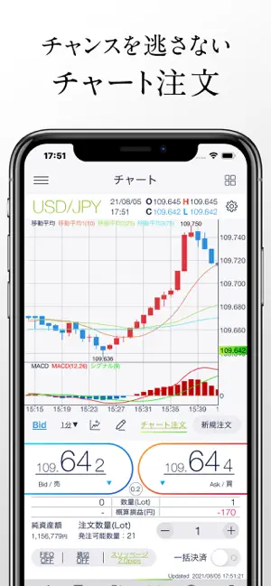FXチャートを見ながらワンタッチで即時発注も可能。