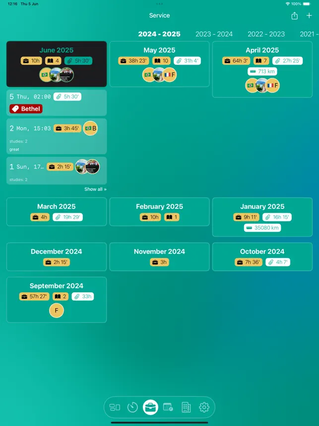 - maps - change your theme (dark mode) - schedule your appointments - track your distance in service - find and manage your favourite verses in the Bible - schedule reading the Bible