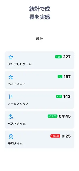 統計の仕様変更について デイリーチャレンジのベストタイムがレベルに関係なく一元化された影響で、 各レベルにおけるデイリーチャレンジのベストタイムが見られなくなっています。 Easybrain様におかれましては、是非データを再度見られるようにしていただきたく… (広告を見ているとはいえ)無課金ユーザーの自分が物申すのは忍びないのですが、是非… それと、これは掲題とは関係ありませんが、 一度正しく入力したマスの数字は、変更できないよう自動ロックがかかると利便性が増すと思われます。 正しく入力したのにミスタップで失敗という扱いになりますと、ヌンッとなります(?)。 こちらも併せてご一考いただけますとありがたいです。 レビューというよりデベロッパへの問合せのような文面になってしまいましたが、 シンプルながらも移動中のちょっとした空き時間などを潰すのに適したアプリだと思われます。