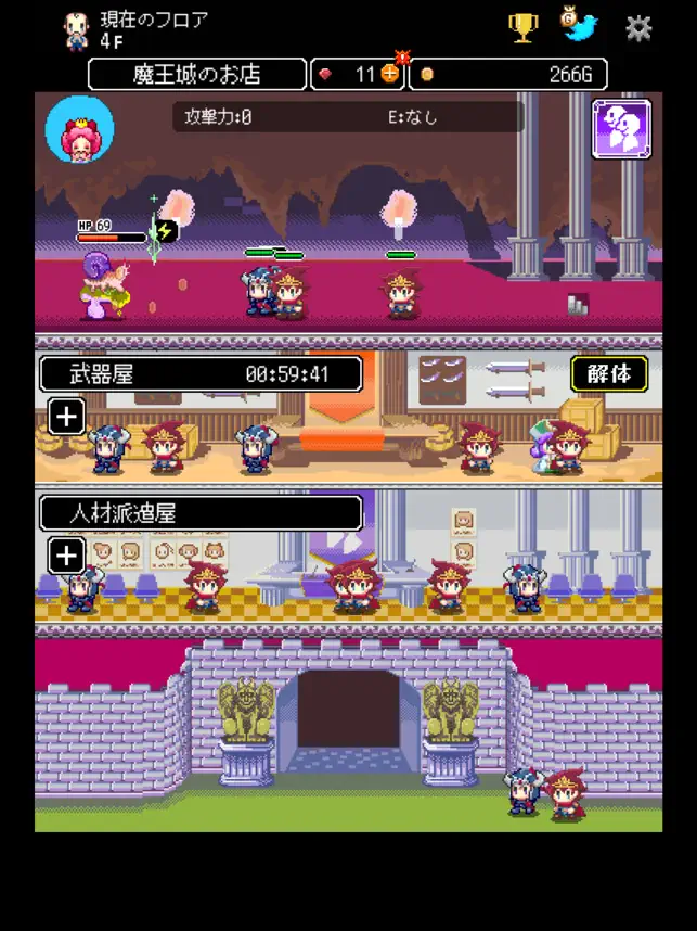 暇つぶしには良い 現在610階まで踏破 何も考えずにぽちぽちボタン押して転生するごとにちょっとずつ登れる階数が増えていくのが飽きなくて良い 地味に魔王倒した後のやり取りも好き 改善して欲しい点 ルビーの全て交換を10万から1000万ぐらいまで増やして欲しい すでに一回の転生で8000万ルビー超えるので800回もボタン押すだけで20分近くかかる レベル上げの長押しが1000ぐらいまで上げるのも時間がかかるから レベルアップ自動化つけて欲しいそれか100単位であげれるやつ 以上が直れば満足できる キャラの強さは未だによく分かりません
