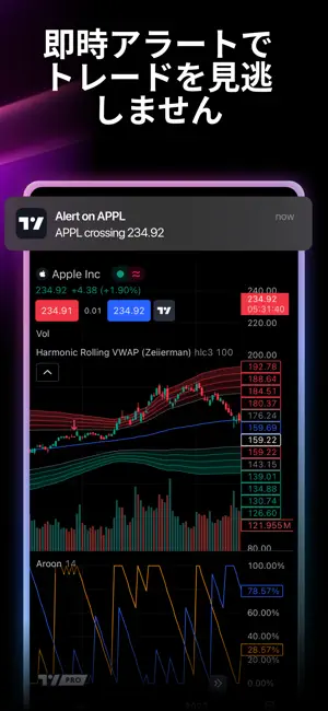 トレードに使うアラートも、かつてないほどパワフルかつ柔軟で、使い勝手が良いものになっています。クラウドベースで、どのデバイスからでもご利用可能 – アラートがトリガーされると、Eメール・アプリ・デスクトップ・Webhookで通知されます。