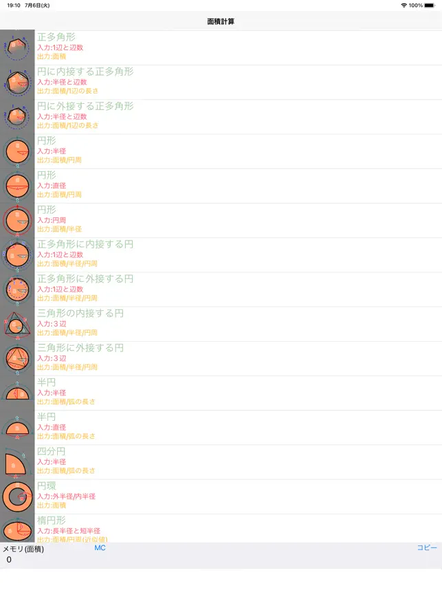 三角形、四角形、正多角形、円、楕円、扇形、楕円扇形、弓形、楕円弓形、放物線などの辺や角度から面積や一部の長さを計算します。