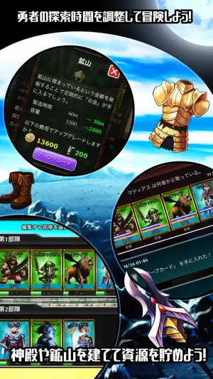 始めてすぐは、やる事のなさに閉口するかもしれない。勇者をダンジョンに置くと、指定時間後に帰ってくるまでほぼやる事がありません。プレイ時間10分待ち時間数時間なんて世界。でも楽しさが分かってくると、気付けば待ち時間の合間にも頭の中でこのゲームの事を思い巡らせるようになる。