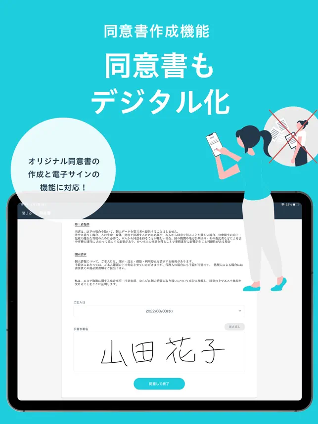 ・オリジナルの同意書が作成でき、電子サインにも対応、作成された同意書はPDFとして保存されて、その場でお客様共有することができます。