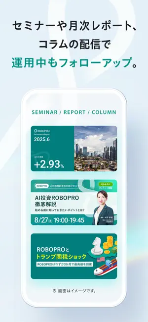 口座開設から運用までスマホ1つで完結。運用開始後も、レベルに応じた無料セミナーや、各種レポートなどを公開しており、フォローアップも万全です。