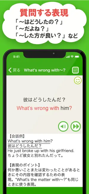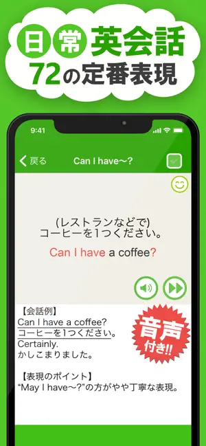 英会話でよく使う英語表現1つ1つに対して、それぞれ5種類の実用的な英会話フレーズを収録。 会話例とワンポイント解説、さらにネイティブの英語音声付き!すべて無料! さらに、ネイティブの英語音声をまとめて再生できる「フレーズ聞き流し」機能や、自分の英語音声が自動採点される「スピーキング練習」機能も収録。 英会話の勉強にオススメ!このアプリを繰り返し使って日常英会話表現を習得しよう! 本アプリ「日常英会話表現 リスニング対応!ネイティブが使う72の定番英語表現」は無料です。 すべての英会話フレーズ、英語音声、リスニング/聞き流し、発音練習機能を無料でご利用頂けます。
