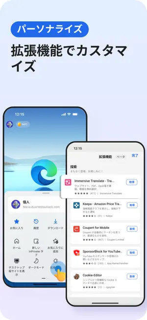 Microsoft Edge では、生産性、パーソナライズ、エンターテイメント向けの強力な拡張機能を利用できます。拡張機能を使えば、プライバシー保護、Cookie のブロック、位置情報の非表示、YouTube の気になる要素の削減が可能です。ブックマークやメモツールでコンテンツの保存・共有を簡単に行い、整理整頓できます。翻訳ツールで生産性を向上させましょう。価格トラッカーやクーポン検索機能で、賢くショッピングし、節約も実現。Microsoft Edge を拡張機能でカスタマイズし、あなただけの安全でパーソナライズされたブラウジング体験を。