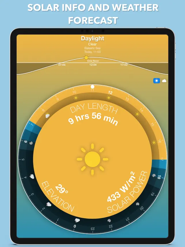 Spin the solar disk to move through the time of day or up to five days ahead, and instantly see sunrise and sunset times, day length, twilight, golden hour, solar power output, and even the UV Index — all visualized with precision and style.