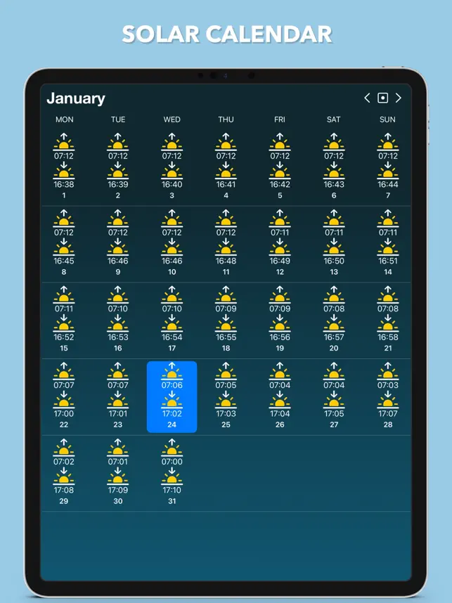 On the Calendar page, explore sunrise and sunset times for any date of the year, and tap a specific day to reveal more detailed solar information.