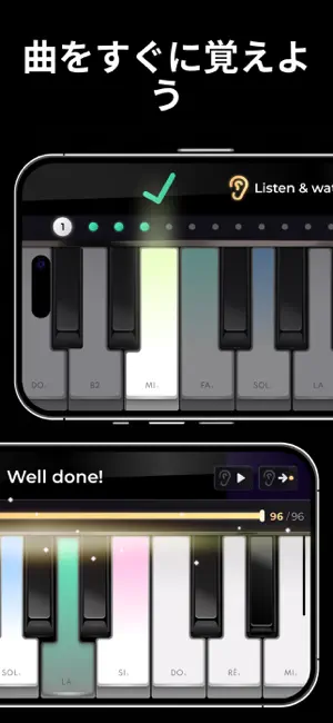 ピアノの曲を繰り返し見て、記憶する。正しい音符をタップして聴力を鍛える。自分の記憶力に驚くことでしょう。