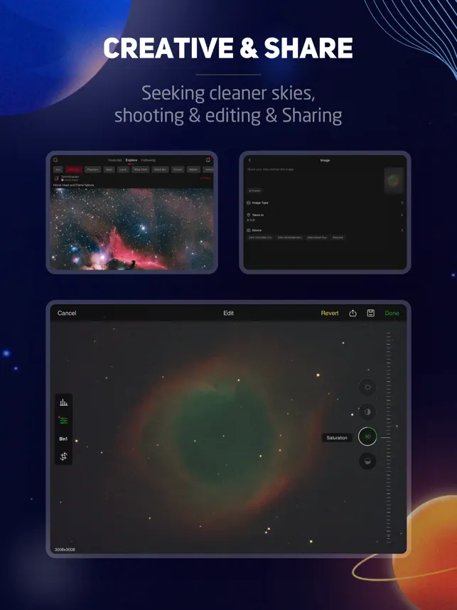 ASIAIR has SkyAtlas built-in. It can handle almost all DSO and Planetary imaging tasks. Such as preview, plate solve, auto-focus, polar-align, guiding, plan (multi-target, mosaic), video recording, live stacking, post-stacking, etc. You can even share and chat with global Astro-pals.