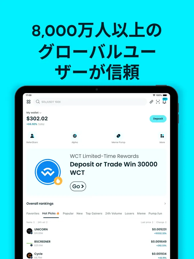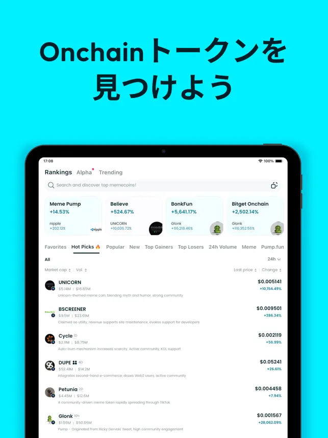 新しいマルチチェーントークンのリアルタイム追跡により、Bitget Wallet Alphaは取引シグナルを特定し、モバイルでいつでも有望な銘柄を発見することができます。 - 安定収益で安全に資産運用 トッププロトコルを集約することで、ユーザーはワンクリックでメインストリームとステーブルコインの獲得キャンペーンに参加でき、最大8%のAPYを提供します。 - Web3のフリクションレスな決済 アプリ内マーケットプレイス、Scan to Pay、Crypto Cardにより、暗号資産決済をグローバルかつ簡単にナビゲートできます。 - 資産のセルフカストディ、保証されたセキュリティ MPCウォレット、スマート監査、リアルタイムのリスクコントロール、3億ドルの保護基金をサポートし、お客様の資産はお客様の管理下にあります。 - 取引、資産運用(Earn)、発見、決済 - すべてが1つのウォレットに Bitget Walletを使用して、暗号資産の可能性を解き放ちましょう。 詳細はこちらをご覧ください: 公式ウェブサイト:https://web3.bitget.com/ja X(Twitter):https://x.com/BitgetWalletJP Telegram:https://t.me/BitgetWalletJP Discord:https://discord.gg/bitget-wallet Bitget Wallet:誰でも暗号資産を使えるように