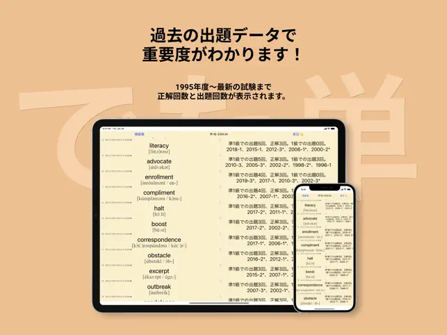 英検®準1級・語彙問題対策として選定した単語・熟語「5572単語」を収録しています。 単語データは現在も追加中です。 ステージ1: 1380単語 ステージ2: 1406単語 ステージ3: 1291単語 ステージ4: 1495単語 ステージ5: 1348単語(年度別掲載) 合計: 5572単語 英検の語彙問題は過去問から多く出題され、頻出の単語は繰り返し出題されています。アプリ内の各品詞のABCの範囲には正解として出題された単語と選択肢としての出題回数が多い単語をまとめています。A〜の順に優先的に学習することで効率よく合格点へ近づくことができます。 <現在カバーしている英検準1級の過去問84回分> 1995年第1, 2回 1996年第1, 2回 1997年第1, 2回 1998年第1, 2回 1999年第1, 2回 2000年第1, 2回 2001年第1, 2, 3回 2002年第1, 2, 3回 2003年第1, 2, 3回 2004年第1, 2, 3回 2005年第1, 2, 3回 2006年第1, 2, 3回 2007年第1, 2, 3回 2008年第1, 2, 3回 2009年第1, 2, 3回 2010年第1, 2, 3回 2011年第1, 2, 3回 2012年第1, 2, 3回 2013年第1, 2, 3回 2014年第1, 2, 3回 2015年第1, 2, 3回 2016年第1, 2, 3回 2017年第1, 2, 3回 2018年第1, 2, 3回 2019年第1, 2, 3回 2020年第1, 2, 3回 2021年第1, 2, 3回 2022年第1, 2, 3回 2023年第1, 2, 3回 2024年第1, 2, 3回 2025年第1, 2回 *アップデートを続け、最新のデータを収録していきます。 *すべて音声追加予定です。 このアプリでは単語が品詞別にカテゴリー分けされており、過去の英検での正解になった回数、出題頻度の高い順にリストアップされています(正解数と頻度が同じ単語の順番はランダムです)。 日本語訳は正解になった意味を採用。そのほかは複数の辞書が第一の意味としているものを採用しました。 アプリ内の練習とテストを繰り返し、ユーザーが自由に振り分けられる単語帳で苦手単語を復習できます。
