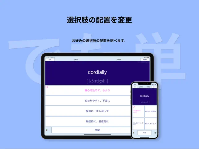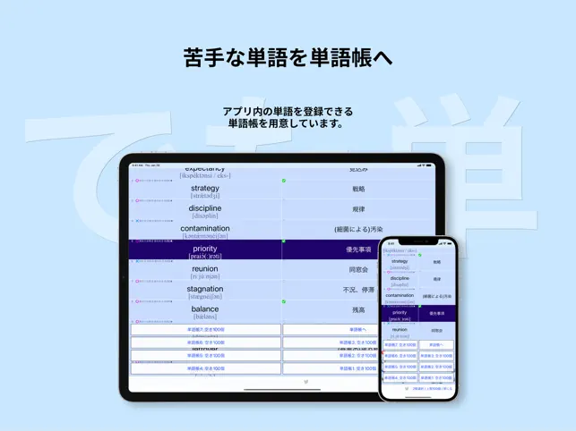 <練習> 練習したいカテゴリー(例:形容詞A)を選択すると、設定画面が現れます。 自由に設定し、「練習スタート」を押してください。 <単語テスト15問> 左下「テスト15問」では、該当カテゴリー内の単語がランダムに15問出題されます。 出題間隔や出題順は英単語を記憶しやすいように最適化されていきます。 15問すべて答え終わると、タイムとスコアの結果が出ます。 素早く正解できると高いポイントを獲得でき、グラフで履歴が残ります。 テストで出題された15問は一覧となって表示されますので、復習に便利です。 <単語帳機能> 「日本語訳」のセル右上をタップするとチェックされ、チェックした単語を「単語帳」に登録できます。 チェックし、画面右下に出てくる「単語帳を選ぶ」をタップしてください。 単語帳は7つ用意されています。苦手単語のオリジナル・単語帳を作ることができます。