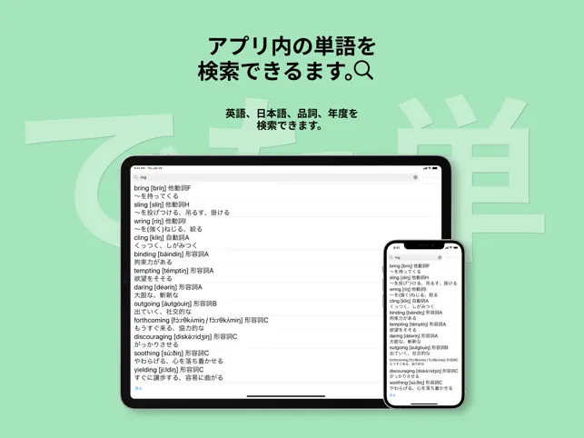 <アプリ内検索> 検索ページでは単語や意味、発音記号から検索することができます。検索した単語から品詞別リストへ移動できます。