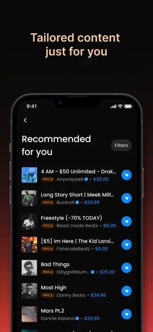 Feed personalization and recommendations: Listen to curated playlists like Drake, Lil Baby, and Juice WRLD Type Beats (and many more). The more you stream your favorite beats, the better we'll understand you as a creator. It's our mission to provide you with new and fresh content tailored to your tastes.