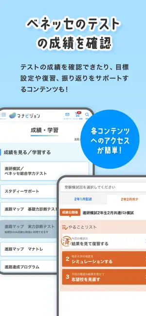 職業・学問、大学・短大や専門学校の豊富な情報検索、オープンキャンパス予約、入試情報の閲覧、進研模試/ベネッセ総合学力テストやスタディーサポートの成績確認など多様な機能を提供。進路検討から日々のテストの予習・復習までサポートします。