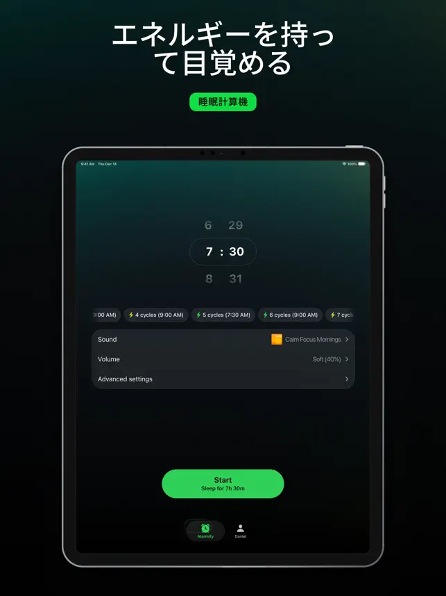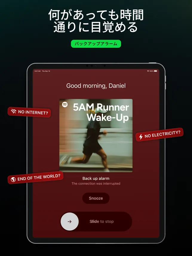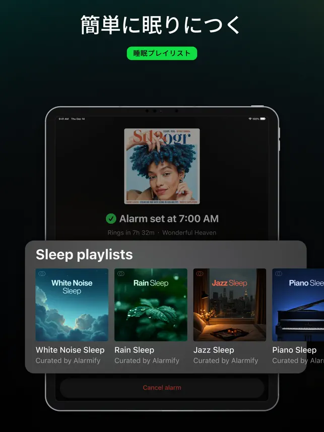 ■ **幸福ホルモン** うるさいアラームの不快な感じを忘れましょう。すっきりとしてエネルギッシュでやる気に満ちて目覚め、あなた自身のペースで一日を始める利点を感じてください。 ■ **睡眠用プレイリスト** すぐに眠りにつくためにデザインされた6つの睡眠用プレイリストを厳選しました。 ■ **シンプルで直感的なインターフェース** 必要なものはすべて手元にあります。アラームとプロフィールの2つのセクションだけです。 ■ **広告なし** 私たちはクリーンで集中できる体験を信じています。Alarmifyでは広告を一切表示しません。 ■ **迅速なサポート** お困りですか?設定セクションから直接お問い合わせください。 ■ **無料トライアル** Premiumにアップグレードする前に、Alarmify™のすべての機能を無料でお楽しみください。 Alarmify™はSpotify Inc.とは提携していません。 詳細については、[利用規約](https://night.so/terms/)をご覧ください。