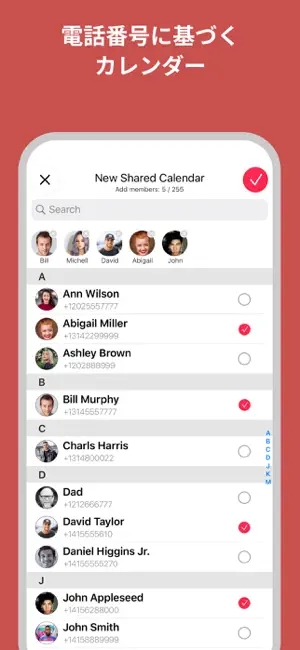 共有カレンダーにメンバーをすばやく簡単に招待できます。メンバーにシンプルにリンクを送信するか、連絡先リストの電話番号でメンバーを招待します。メンバーはあらゆる端末からすぐにカレンダーを確認できます。イベントが追加または更新されると、共有カレンダーのメンバーはその内容をリアルタイムで確認できます。