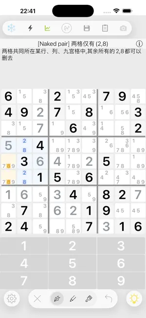 写入候选相关功能追加建议 算法和生成的难度很棒!最吸引我的是提示会给出一些技巧,能成为相应技巧的练习。 但是在每个格子输入数值或者删除候选的时候稍微有点不方便,容易误操作。 现在输入数值可以支持这种方式:点击场上黑色固定某数字(例如5),全场所有的同数字(5)都会高亮,(在写入状态🖋️下)再点击某个空格的话该空格就会写入此数字(5) 。 功能追加的建议如下: 1. 在全场的5高亮的情况下,在*删除候选词✏️*状态下实现能通过点击某个空格删除该空格的现存候选数5的标记。 2. 除了黑色的固定数字之外,*已经填入数字的格子*也实现点击后(或者长按?)能高亮全场其他的同数字。 (3. 高亮后的点击空格,现状是写入数字作为正式回答,如果能改成*写入的是候选✏️*,那能和1配合成一套合理的逻辑。这样点话可能需要区分一下输入回答和输入候选的方式了)