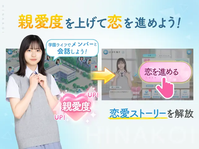 プレイヤーは転校生として日向坂46メンバーと出会い、放課後や休み時間の会話を通して絆を深めながら、伝説のアイドル部復活を目指します。