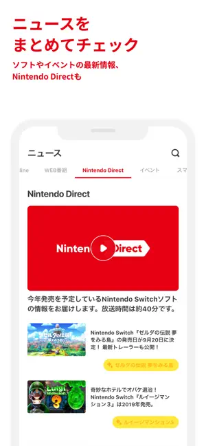 ・任天堂が最新情報を直接おしらせする「Nintendo Direct」もこのアプリで視聴できます。最新の放送予定は通知でもおしらせしますので、ライブ配信の見逃し防止にもお役立てください。また、過去のアーカイブ動画などもアプリから見ることができます。