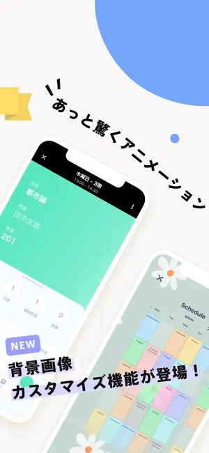 とても可愛らしいです! 新大学1年です。 いろいろな時間割管理アプリを入れて試して みましたが、個人的にはこのアプリのデザインが 一番シンプルで好みでした! デザイン性が高い点は女子にはとても嬉しいです シンプル故使い勝手もいいと思います ただ希望をいうなら、 ・科目名、教授名を入れるページにメモ機能 (なんの科目なのか、どういった特徴のクラスか、等をメモできる欄) *科目の"授業ごと"にとれるメモはありがたいですが、"その科目自体"のメモをできるスペースが欲しいです ・各時限の提出課題などの通知つき機能 ・次回授業までのto doリスト 等あればもう間違い無いと思います…! まだ大学生活に慣れていないので このような機能があれば尚のことありがたいです… たくさんの要望と下手な説明申し訳ありません🙇♀️ 運営さんご覧になってたらご検討お願いします
