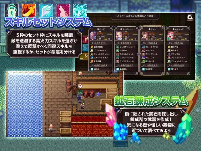 街やダンジョンに隠された『鉱石』を街の錬成所に持っていくことで、装備を作成できます。各錬成所で特色のある装備を錬成し、戦いの手助けとしましょう。
