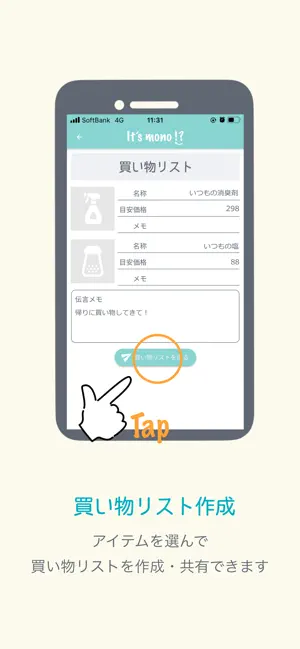 It’s mono !?(いつものアレ)は種類が多くて間違いやすい日用品を写真で記録・管理できるアプリです。そろそろ買いたい日用品をチェックしたり、家族が使っている日用品を共有したりすることも可能です。買い物リストをLINEやメールで送れば、おつかい依頼もスムーズ!