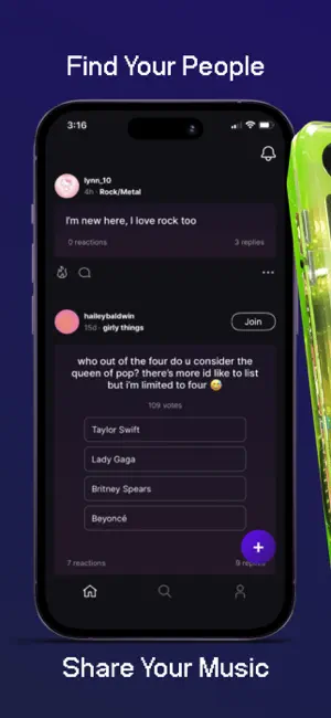 We’re about realness and community. Find others who dig the same things as you or see what’s trending. Whether its hip-hop, metal, nostalgia, or whatever music you're into!