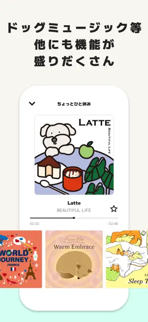 【犬用音楽】犬用に開発されたオリジナル音楽を多数収録。ゆったりタイムやふれあい・ドライブなどいろんなシーンで活用できるプレイリストもご用意。