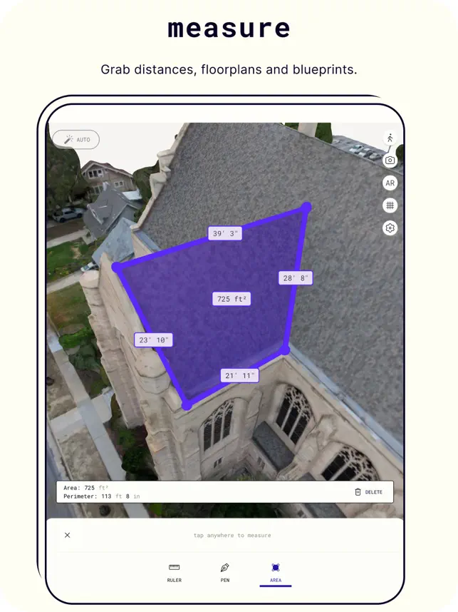 Polycam 3Dキャプチャは寸法的にも正確であるため、任意の2点間の距離を簡単に測定できます。測定値は、通常、約1インチ、つまり数センチメートルまで正確です。