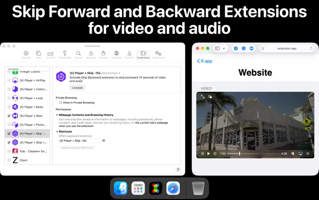 - プレーヤー > 前後にスキップ:この拡張機能は、ビデオとオーディオを15秒早送り/巻き戻しします。