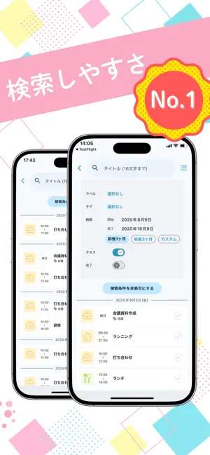 タイトル検索・期間検索・完了、未完了の切り替え・タスク・メモの切り替えで確認したいToDoを素早く表示することができます。